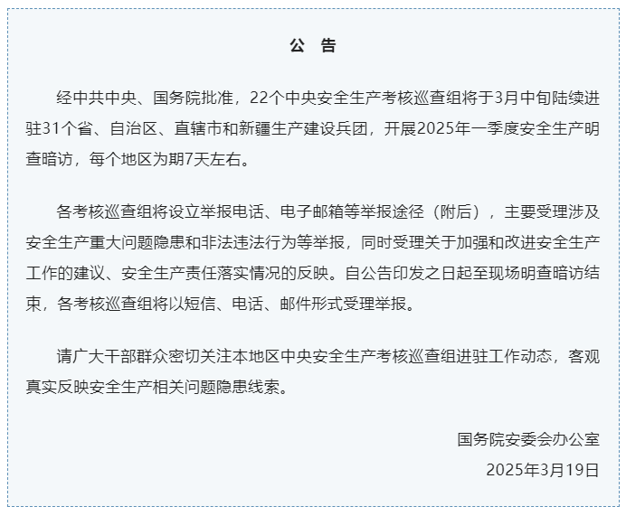 新华社北京3月19日电 记者19日从应急管理部获悉,2025年度中央安全生产考核巡查一季度安全生产明查暗访日前正式启动。由国务院安委会有关成员单位负责同志带队的22个中央安全生产考核巡查组陆续进驻31个省份和新疆生产建设兵团。